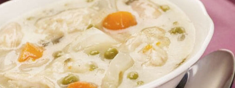 Add the chicken broth and bring to a boil. Add the peas and chicken. Drop spoonfuls of dough into the broth, you should have about 12.