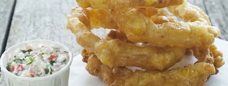 These sweet corn onion rings are also great tucked inside your favorite turkey, pulled pork, or smoked ham sandwich.